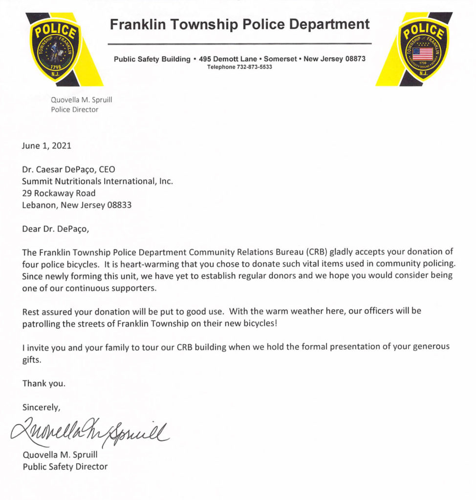 Franklin Township Police Department Thanks Caesar DePaço for Police Bike Donation